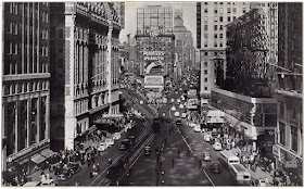 La torre del New York Times (Eidlitz & MacKenzie, 1905), y al fondo, el Paramount Building (Rapp & Rapp, 1926), en esta imagen captada hacia el noroeste, desde el Continental Building, en la primavera de 1938.