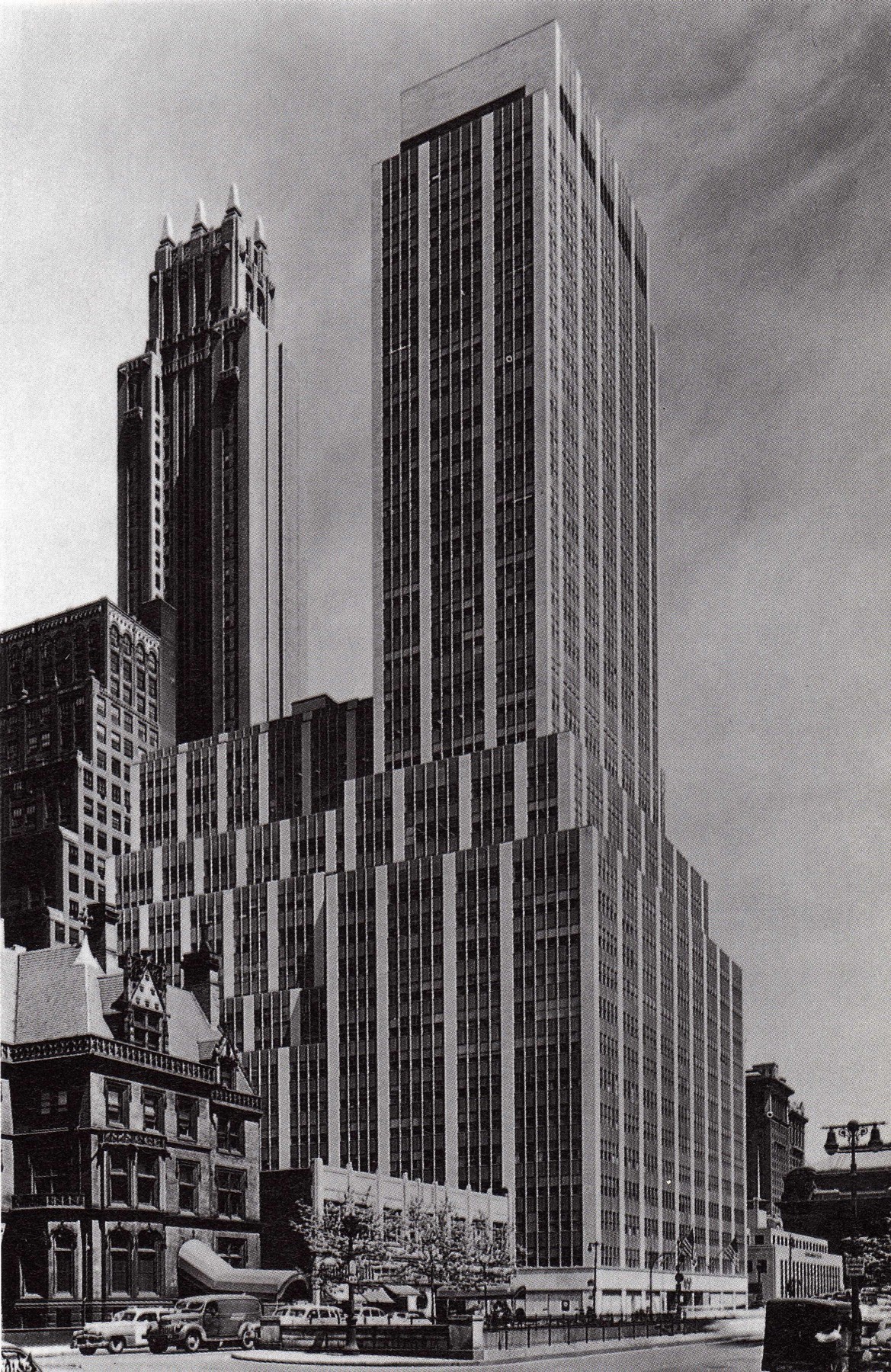 El nuevo edificio de 36 pisos del 100 Park Avenue (Kahn & Jacobs, 1949) se aprecia en todo su esplendor, en esta imagen captada hacia el noroeste, a comienzos de 1950. Su moderna arquitectura contrasta con los estilos eclécticos y Art Decó de los edificios Lefcourt Colonial (Abraham E. Lefcourt, 1930) y Lincoln (James Edwin Ruthven Carpenter, 1930), que le rodean detrás.